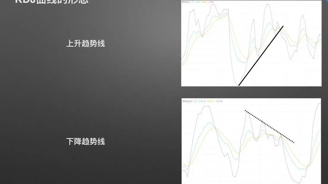 KDJ曲线的形态中常用的有上升趋势线和下降趋势线两种,分别如图所示,上升趋势线如上图中黑色实线所示,下降趋势线如下图中黑色虚线所示。