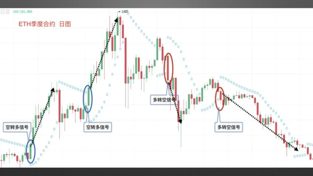 截图来自欧易OKX ETH季度合约日线图,当币价K线向上有效突破位于K线上方的SAR指标时,形成空转多的转势信号,后市大概率上涨;当币价K线向下有效跌破位于K线下方的SAR指标时,形成多转空的转势信号,后市大概率下跌。
