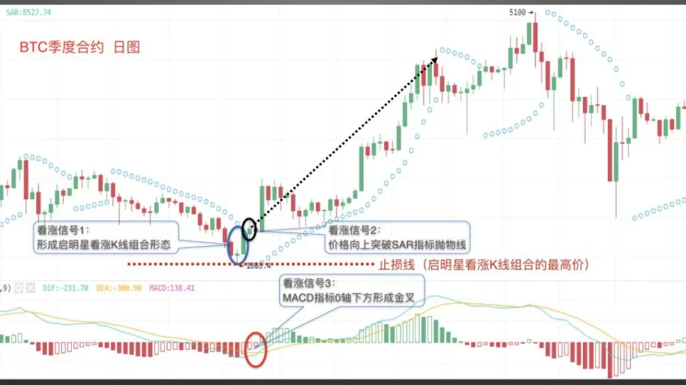 案例二:SAR指标配合K线组合形态及MACD的实战应用,截图来自欧易OKX BTC季度合约日图,币价在SAR指标下方运行,底部形成了启明星看涨K线组合形态,形成看涨信号1;接着价格向上突破SAR指标抛物线,形成看涨信号2;同时,MACD指标在0轴下方形成金叉,出现看涨信号3,止损线可设在启明星看涨K线组合形态的最低价,之后币价迎来上涨。