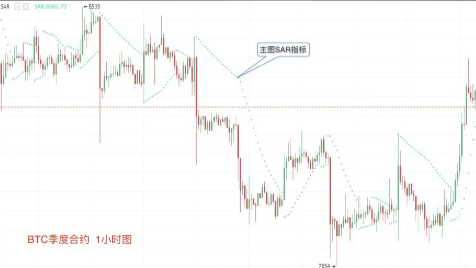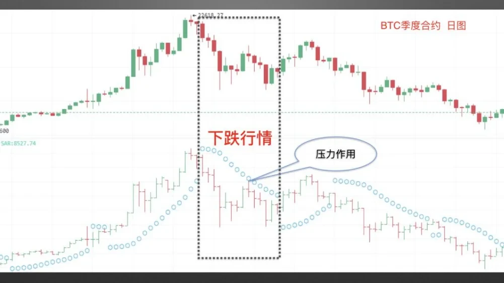 在下跌行情中,截图来自欧易OKX BTC季度合约日线图,如图中黑色虚线框区域所示,当价格线运行在SAR指标曲线的下方时,表明此时该指标对币价起压力的作用,促使币价进一步下跌,延续币价下跌趋势,投资者应继续以观望为主,直到SAR指标再度发出明确的买入信号。