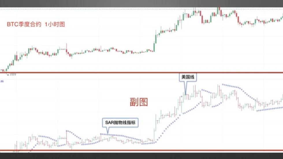 副图SAR指标:截图同样来自欧易OKX BTC季度合约1小时图,图中红框中显示部分为副图区域,该指标区的价格标记为美国线,围绕美国线上下的抛物线为副图SAR指标。