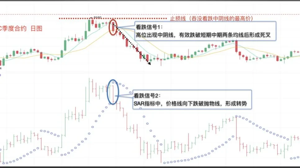 案例一:SAR指标配合两条均线的实战应用,截图来自欧易OKX BTC季度合约日图,当价格线位于SAR指标抛物线上方运行时,币价不断上涨,价格高位出现中阴线,跌穿短期中期两条均线,并形成死叉,此为看跌信号1;同时SAR指标中,价格线向下跌破抛物线,形成看跌信号2,止损位可设在上述中阴线的最高价,之后币价迎来下跌。