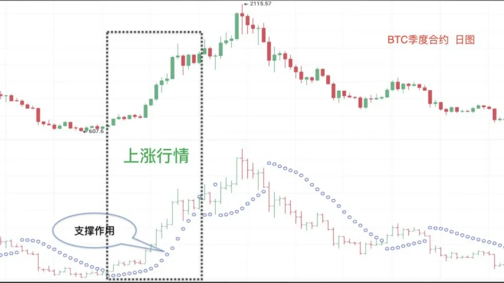 在上涨行情中,截图来自欧易OKX BTC季度合约日线图,如图中黑色虚线框区域所示,当价格线运行在SAR指标曲线的上方时,为上涨行情,表明此时该指标对币价起支撑的作用,支撑币价不断上涨,延续币价上涨趋势,投资者短期可以继续持币待涨,直到SAR指标再度发出明确的卖出信号。