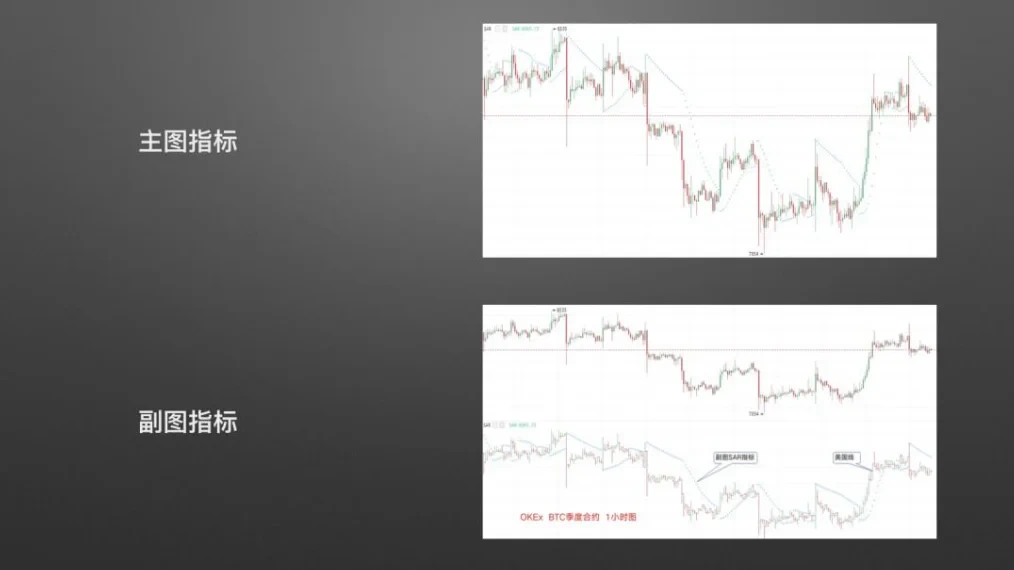 主图SAR指标:截图来自欧易OKX BTC季度合约1小时图,图中由小蓝点构成的抛物线即为SAR指标,英文全称“Stop and Reverse,中译为停损点转向指标,因其形态也被称作抛物线指标,是一个判断趋势转变的辅助指标。