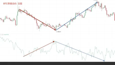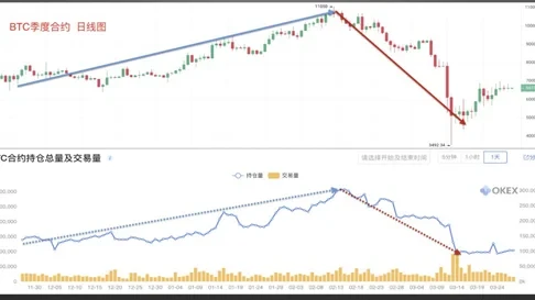 BTC季度合约持仓总量和交易量实战案例:截图来自欧易 BTC季度合约日线图,从图中可以看出,下方合约持仓总量走势图与上方币价走势基本保持一致,合约持仓总量逐渐增加,币价持续上涨;相反,合约持仓总量不断减少,币价持续下跌,总体上呈现出同涨同跌的正相关关系。
