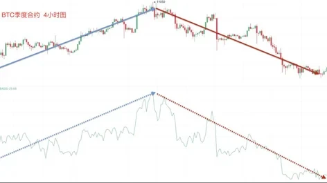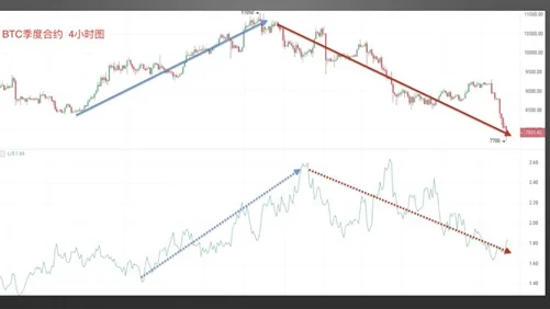 BTC多空持仓人数比案例二:截图来自欧易OKX BTC季度合约4小时图,我们可以看到,币价上涨时,多空持仓人数比同时不断增大;币价下跌时,多空持仓人数比同时不断减小,此时币价与多空持仓人数比指标走势呈现正相关。