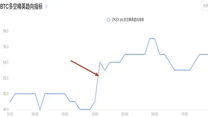 截图来自欧易 BTC合约多空精英趋向指标1小时示意图,图中红色箭头所指示的蓝色曲线为BTC合约多空精英趋向指标走势图,该指标反映持仓的精英操盘手账户排名头数百个净持仓(即净头寸)的多空比例。