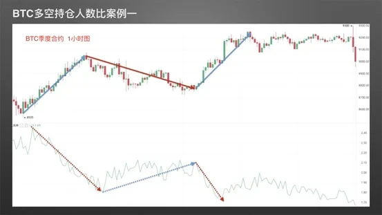 BTC多空持仓人数比案例一:截图来自欧易 BTC季度合约1小时图,我们可以看到,币价上涨时,多空持仓人数比同时不断减小;币价下跌时,多空持仓人数比同时不断增大,此时币价与多空持仓人数比指标走势呈现负相关。