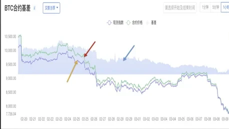 截图来自欧易 BTC合约基差示意图,图中黄色箭头所指示的蓝色曲线代表现货指数,红色箭头所指示的绿色曲线代表合约价格,图中蓝色箭头所指示的蓝色区域为BTC合约基差,合约基差是指同一时刻现货指数价格与合约价格及其差值的变化情况。由于合约价格比现货价格对市场供需变化或消息的影响更灵敏,虽然趋势相同,但量者走势存在差异。