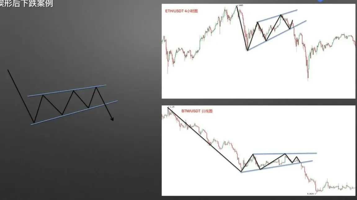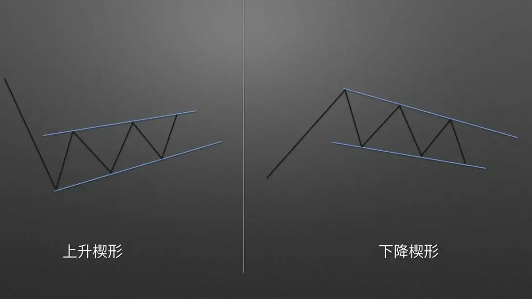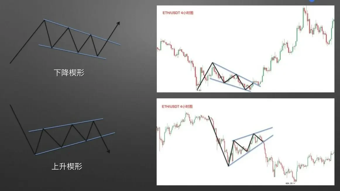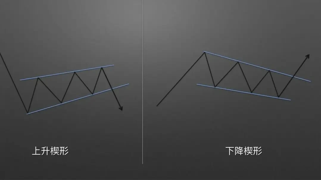 当楔形的两条边呈向上状态运行时,此时所形成的楔形叫作上升楔形,上升楔形在形成之前,币价通常是下跌走势。相反,当楔形两条边呈向下状态时,此时所形成的楔形叫作下降楔形,下降楔形在形成之前,币价通常是上涨走势。