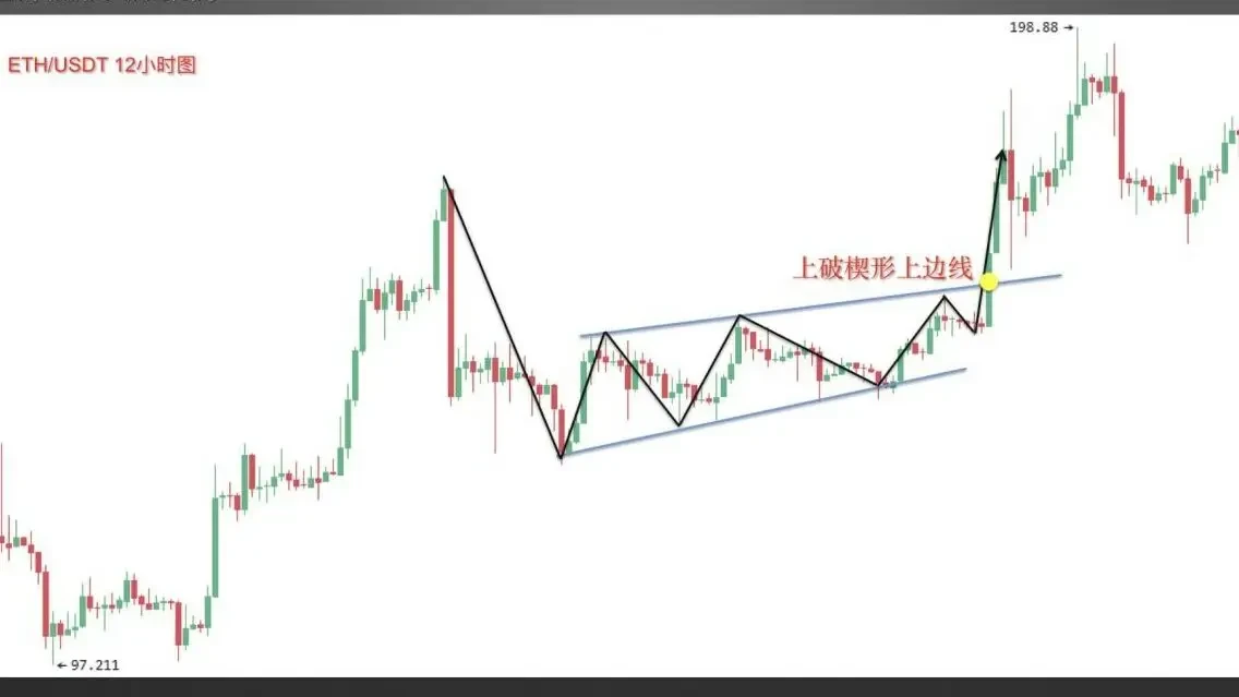上升楔形失败案例:截图来自欧易 ETH/USDT12小时图,币价在形成上升楔形后没有下破下边线,而是选择上破楔形上边线,该上升楔形构筑失败。如果事先已经按照楔形的预期进行操作,发现与预期不符要及时止损离场,以免造成更大损失。