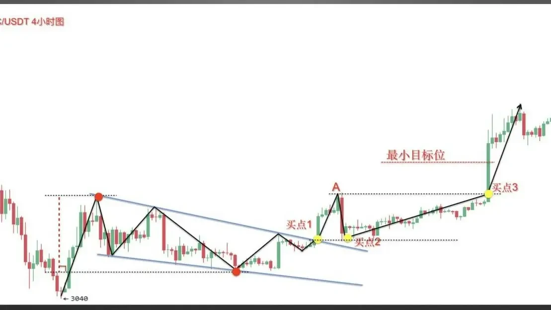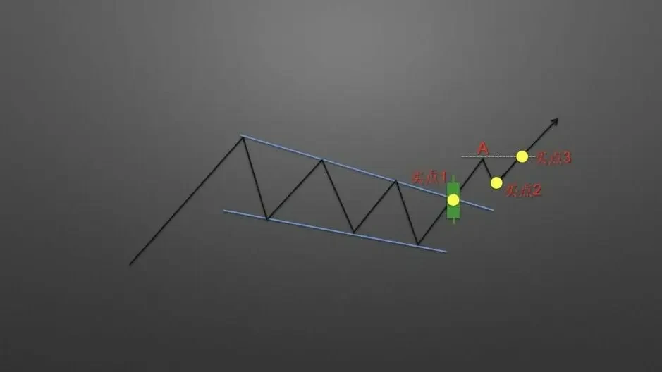 首先来看 下降楔形所对应的三类买点: 当楔形的上边线被明显上破时,第一类买点出现,我们标记为买点1;币价在经过一段上涨后出现回落走势,并且在楔形的上边线之上止跌回升,此时形成买点2; 当币价继续上涨并上破A点时第三类买点形成,标记为买点3。