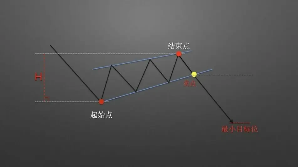 下面再看上升楔形后下跌的最小目标位确立方法:如图币价跌破上升楔形下边线后出现卖点,上升楔形的起始点到结束点的高度就是上升楔形突破下边线之后的最小目标位。