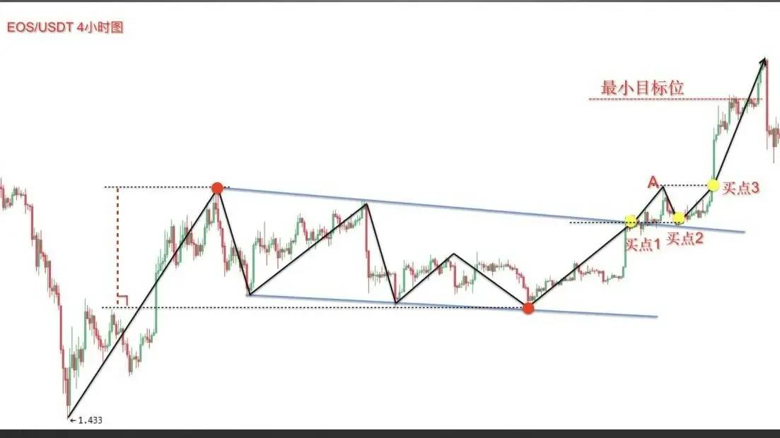 案例二,截图来自欧易 EOS/USDT4小时图,币价在经过一段较大幅度拉升行情后,陷入长时间调整并形成下降楔形,最终币价上破上边线并依次出现三类买点。随后币价如期上涨并到达最小目标位。