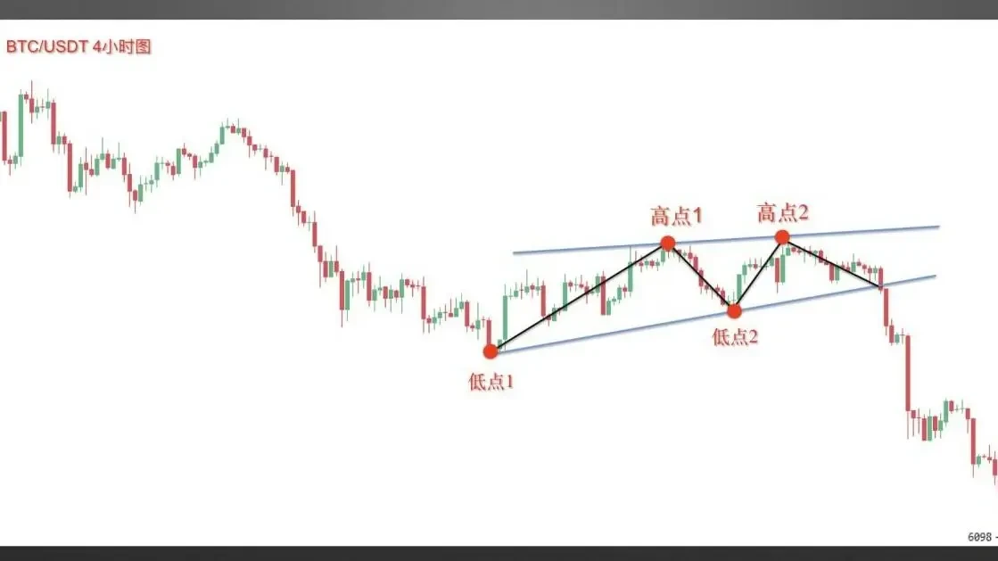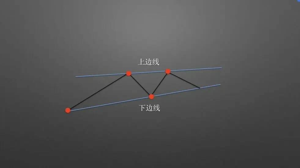 先来认识楔形。在一段走势中,连接币价相邻的两个高点,同时连接与高点相对应的两个回落低点,从而得到两条方向相同,并且逐渐向右侧收敛的两条线,两线之间的图形被称为楔形。