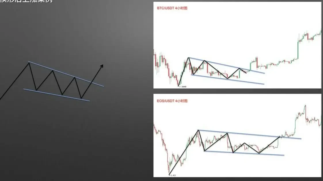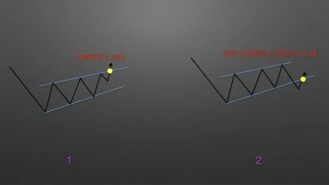 失败的上升楔形特征:第一种情况,在楔形完成后币价并没有下破楔形下边线,而是上破上边线,宣告上升楔形失败。第二种情况,币价短暂下破楔形下边线后又上破。出现这两种情况则宣告上升楔形构筑失败。