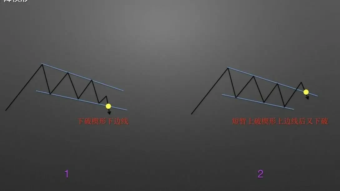 失败的下降楔形特征:第一种情况,在楔形完成后币价并没有上破楔形上边线,而是跌破下边线。第二种情况,币价短暂上破楔形上边线后又下破。出现这两种情况则宣告下降楔形构筑失败。