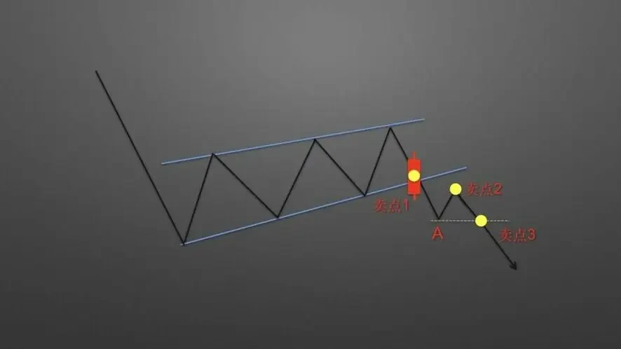 接下来看 上升楔形所对应的的三类卖点。当楔形的下边线被明显下破时,第一类卖点出现,我们标记为卖点1;币价在经过一段下跌后出现反弹走势,并且在楔形的下边线之下滞涨回落,此时形成卖点2;当币价继续下跌并下破A点时第三类卖点形成,标记为卖点3。