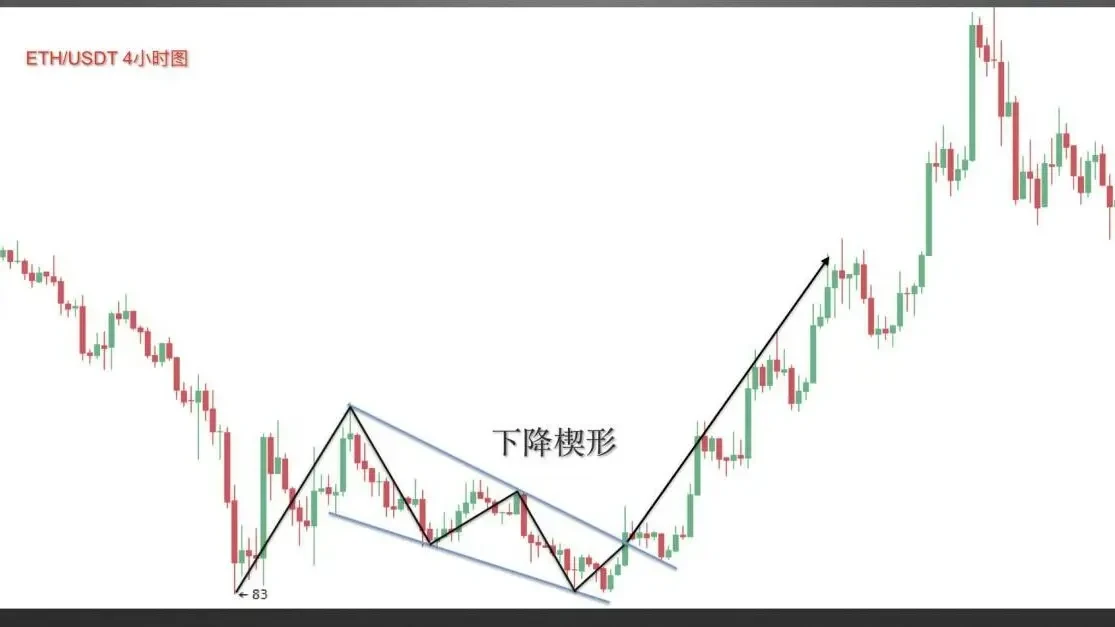 下降楔形案例,截图来自欧易币币交易区ETH/USDT 4小时图,币价在出现一段上涨走势后回调形成下降楔形,1楔形完成后币价继续上涨。