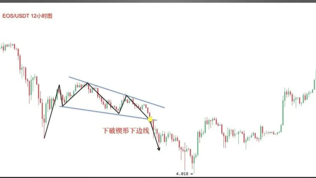 下降楔形失败案例:截图来自欧易 EOS/USDT4小时图,币价在形成下降楔形后并没有选择上破楔形上边线,而是直接下破下边线,该下降楔形构筑失败。