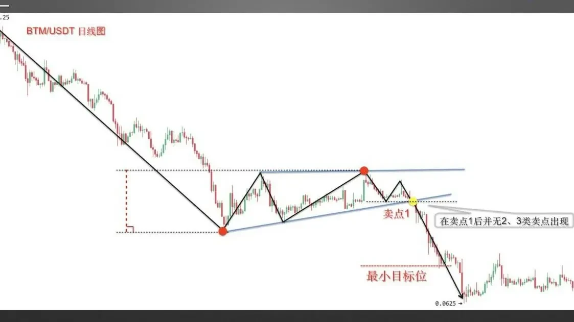 案例二,截图来自欧易 BTM/USDT 4日线图,币价在经历一段长期且大幅度下跌之后出现反弹行情,并最终形成上升楔形。在楔形整理结束后币价如期下破下边线,由于市场处于极度弱势之中,所以在楔形完成后只出现卖点一,并无2、3类卖点出现,随后币价下跌到达最小目标位。