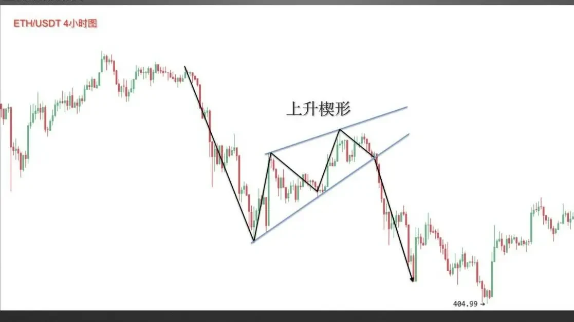 上升楔形案例,截图来自欧易 ETH/USDT 4小时图,币价在经过一段较大幅度下跌之后反弹形成上升楔形,楔形完成后币价继续顺应之前的下跌趋势向下运行。