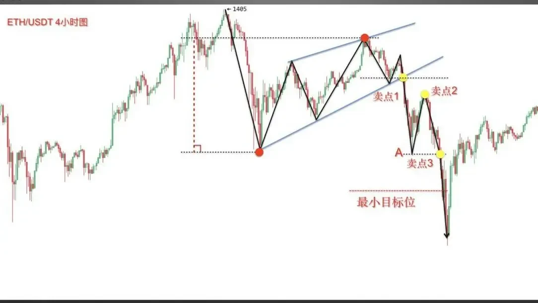 案例一,截图来自欧易币币交易区ETH/USDT 4小时图,币价自高点大幅回落,随后反弹形成上升楔形整理,在整理结束后币价下破下边线依次出现三类卖点,并且继续下行到达最小目标位。