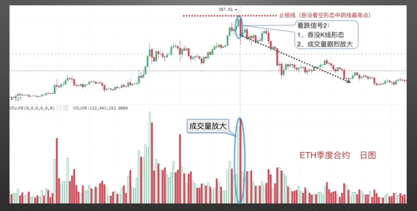 ETH季度合约日线图,如图所示,成交量放出巨量,币价不断上涨,当高位出现第三期课程分享的几种看跌K线组合形态时,形成看跌信号1,但在看跌信号出现后,价格并未如预期下跌,最终止损出局。随着币价进一步拉升,成交量又放出天量,且高位出现看跌吞没,再次出现看跌信号2,建议止损线设在吞没看跌形态中阴线最高点位置,随后币价如预期下跌。