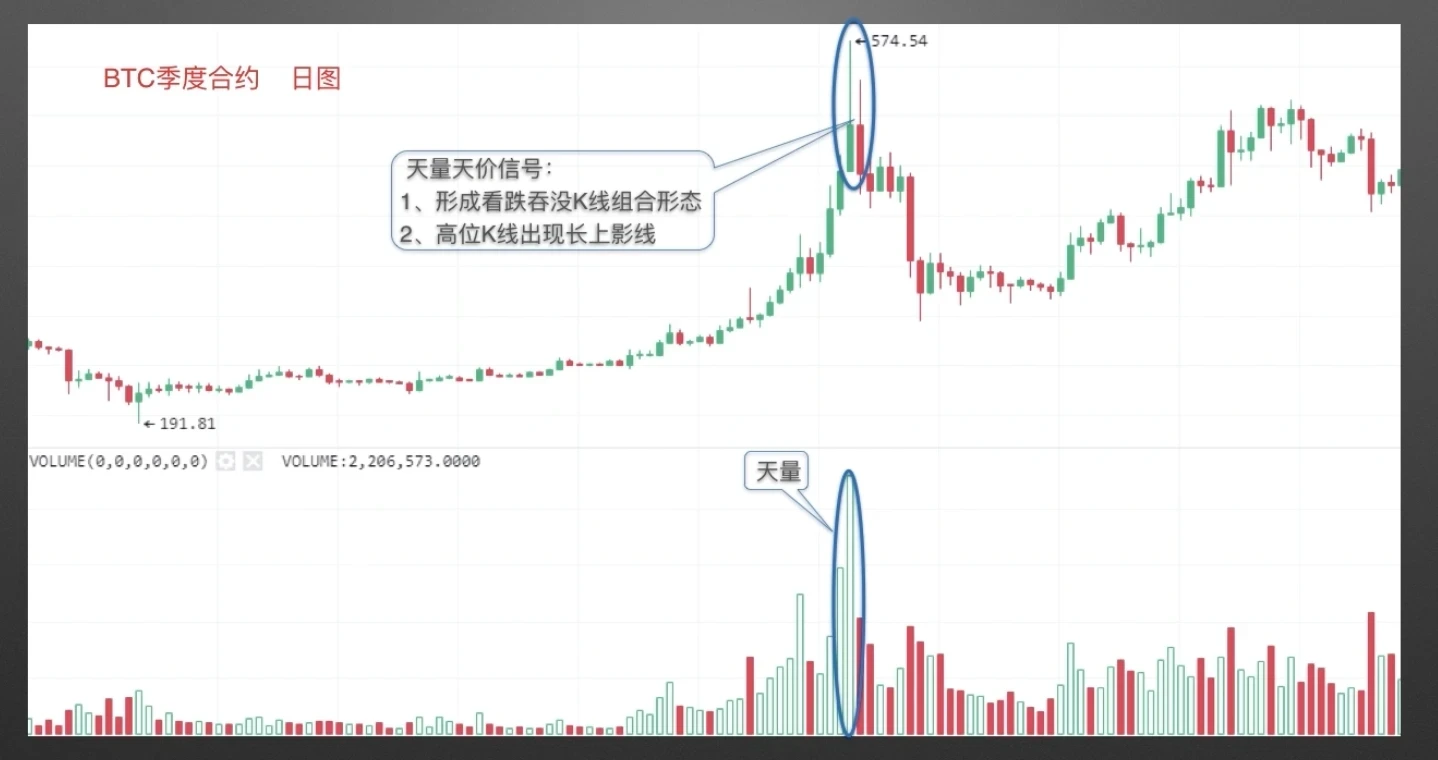BTC季度合约日线图,币价达到一定高度时,对应成交量明显高于临近区域的成交量,形成天量。与此同时,K线高位出现长上影线,且形成看跌K线组合形态时,对应K线价格大概率见顶,形成天价。