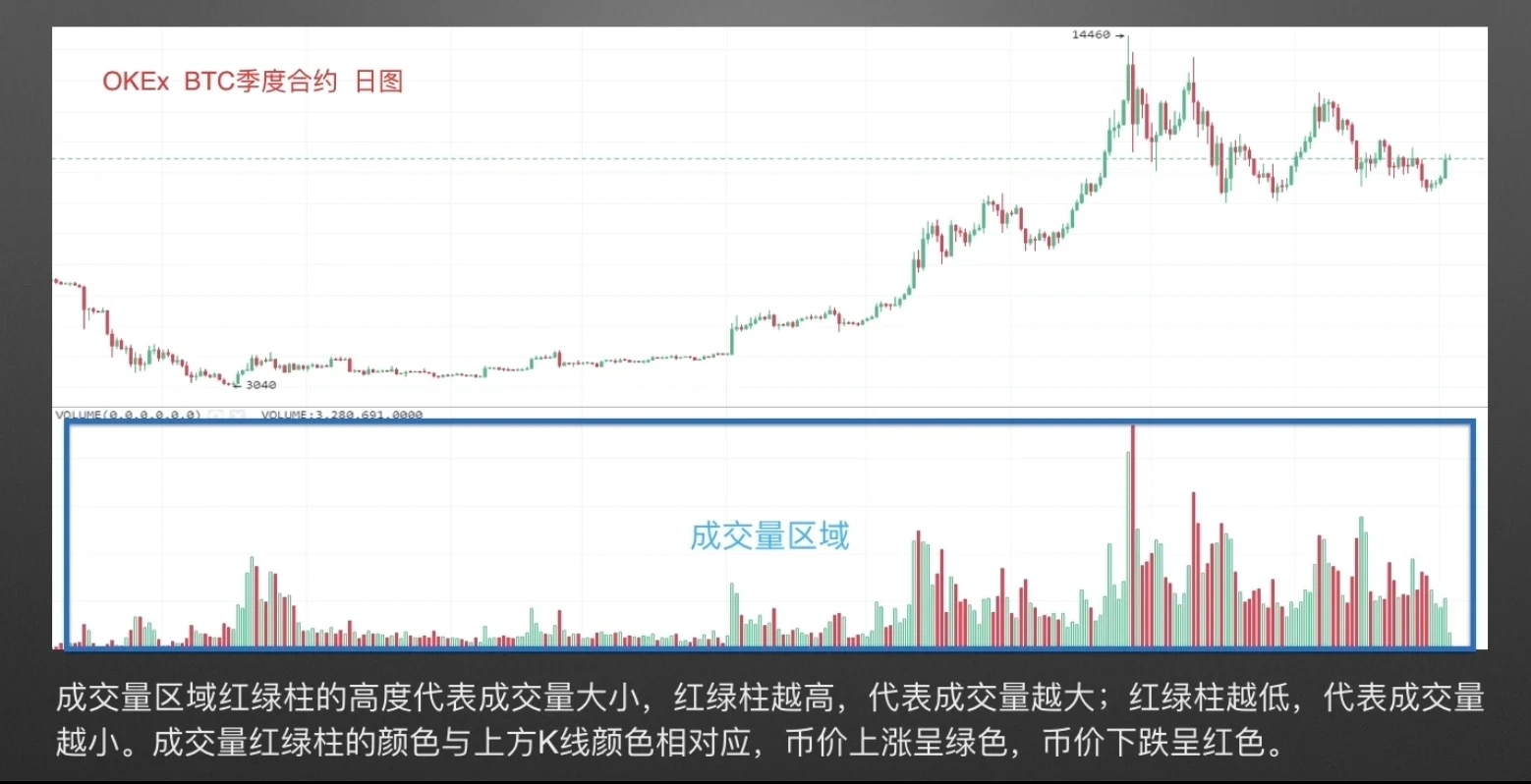 BTC季度合约日线图,下方蓝框为成交量区域,成交量区域红绿柱的高度代表成交量大小,红绿柱越高,代表成交量越大;红绿柱越低,代表成交量越小。成交量红绿柱的颜色与上方K线颜色相对应,币价上涨呈绿色,币价下跌呈红色。
