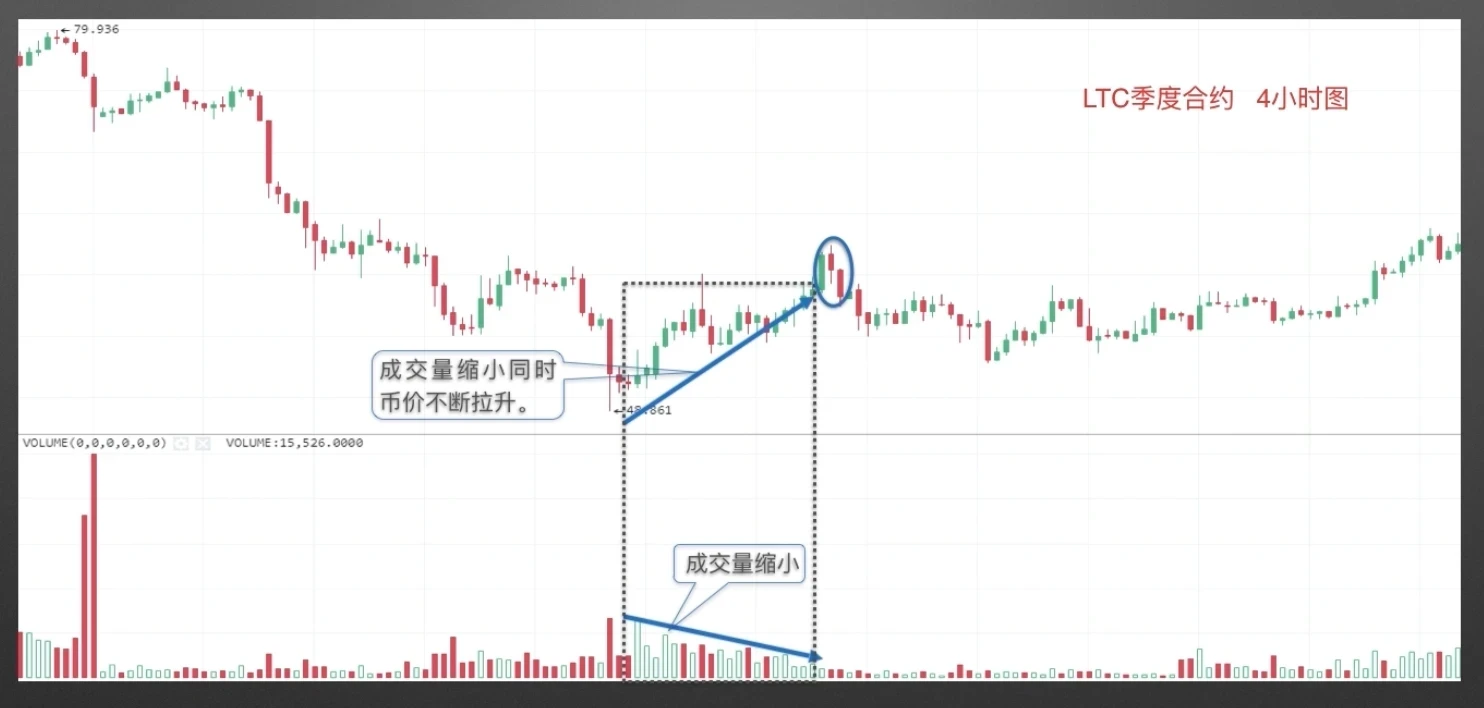 LTC季度合约4小时图,如图中黑线框区域所示,币价成交量不断缩小,币价逐步抬升,量价出现背离,表明看涨能量不断减弱,当出现第三期课程分享的几种看跌K线组合形态时,形成卖出信号。