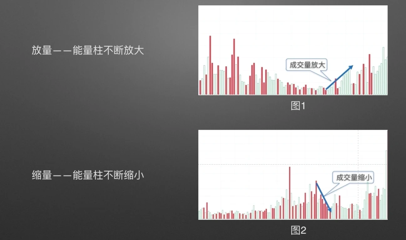 首先来看两种常见的成交量类型,第一种放量如图1所示,成交量柱图不断放大表示成交量逐渐增加,市场逐步活跃;第二种缩量如图2所示,成交量柱图不断缩小表示成交量逐渐减少,市场交易气氛下降,波动率也随之下降。