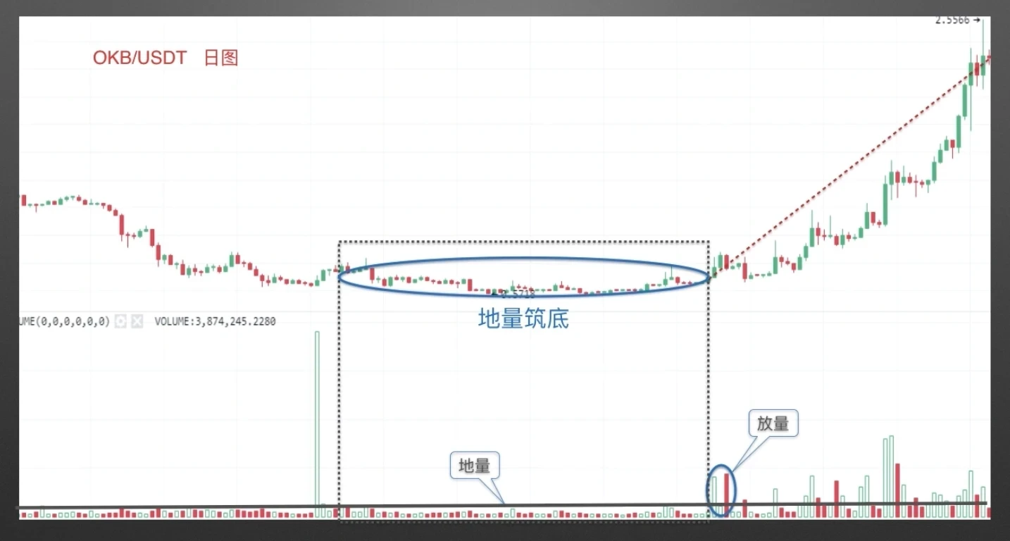 OKB/USDT 日线图,如图中黑色虚线方框所示,当成交量柱图持续偏低,对应币价窄幅震荡时,大概率形成价格筑底。成交量的明显放大如图中小蓝圈所示,可作为新趋势行情开始的信号,如图中红色虚线所示。