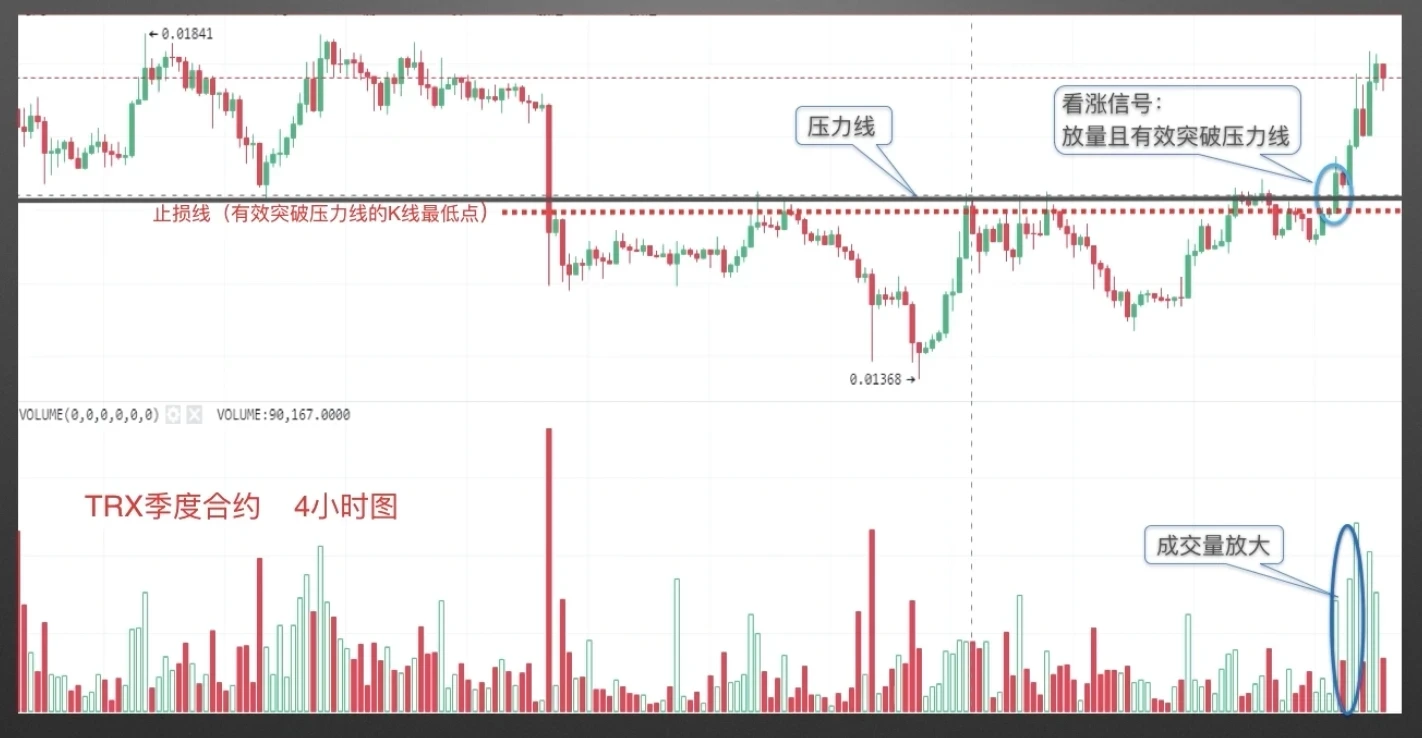 TRX季度合约4小时图,如图所示,图中水平黑线为强压力线,币价多次上攻未果,当K线该周期收线有效突破该压力线,并伴随成交量放大,此为看涨信号,止损位可设在有效突破压力线的K线最低点,如图中红色虚线所示。