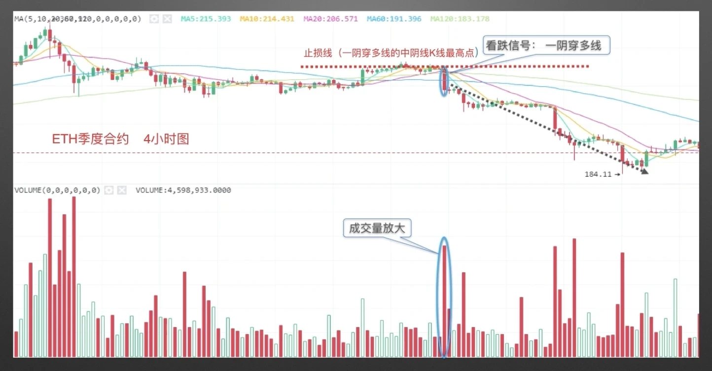 ETH季度合约4小时图,如图中篮圈标注所示,中阴线击穿多条均线,呈现一阴穿多线形态,下方成交量伴随放量,形成看跌信号,止损位可设在击穿多条均线的中阴线最高点位置,如图中红色虚线所示。随后均线呈空头排列,币价沿均线下方运行。