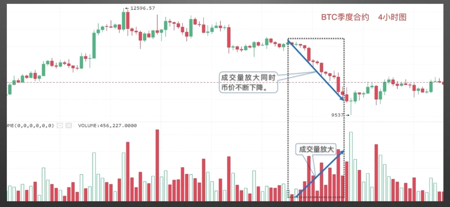BTC季度合约4小时图,如图中黑线框区域所示,随着成交量不断放大,币价不断下降,量价出现背离,表明下跌动能正逐步增强。一般有重大利空消息出现后会放量下跌,其实有时是不理智的抛售行为,需要等待后市出现明显的缩量迹象,才能形成止跌。