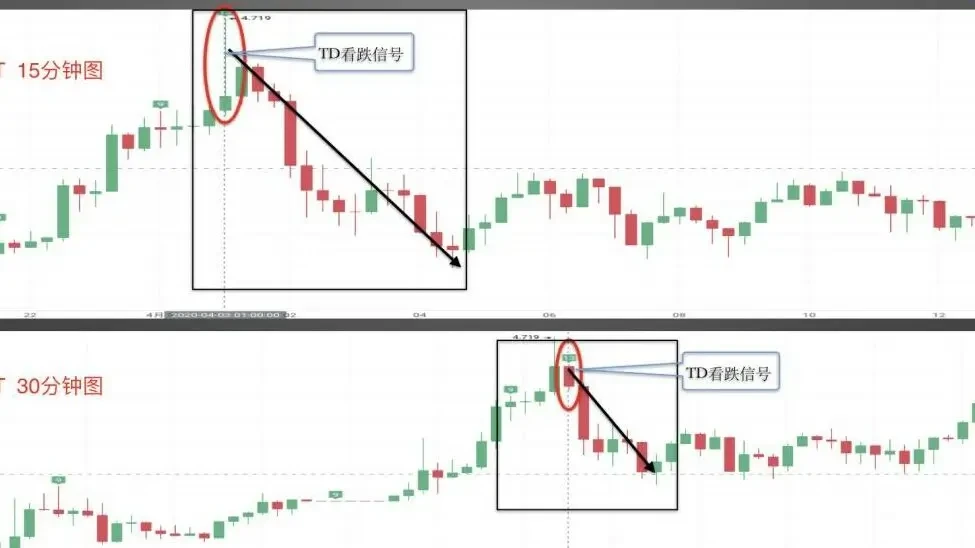 案例二为不同周期下TD指标共振的实战应用,上方截图来自欧易OKB/USDT 15分钟图,下方截图来自欧易OKEOKB/USDT 30分钟图,黑线框区域分别为TD指标在不同周期下相邻时间点共振情况,当不同周期内,TD指标都出现绿色序列13后,此为双重看跌信号,随后币价开始下跌。