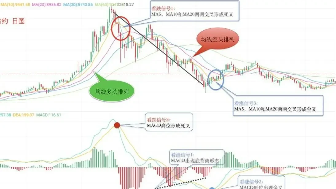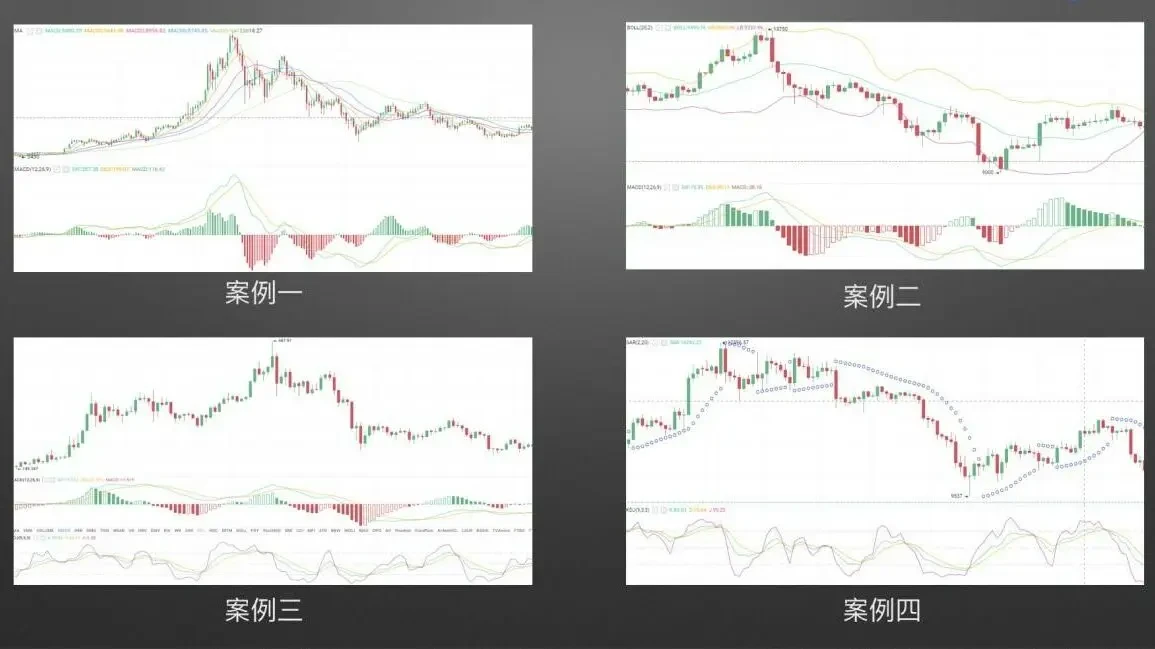 案例一为均线与MACD指标的综合应用,截图来自欧易 BTC季度合约日线图,一开始均线呈多头排列,币价沿均线系统向上运行,当MA5、MA10和MA20两两交叉形成死叉,出现看跌信号1;且MACD指标形成死叉,出现看跌信号2。随后币价持续下跌并不断创新低,均线系统呈空头排列,而MACD指标能量柱底部依次抬高,与币价形成底背离,此为看涨信号1;当MACD指标出现金叉,此为看涨信号2;而MA5、MA10和MA20两两交叉形成金叉,此为看涨信号3。