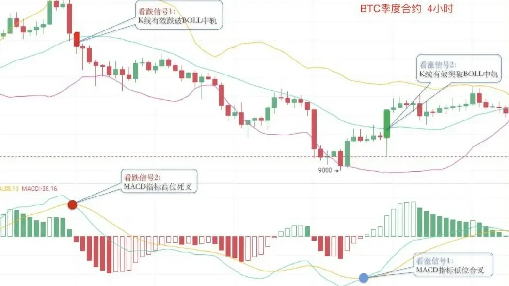 案例二为BOLL线与MACD指标的综合应用,截图来自欧易 BTC季度合约4小时图,当K线有效跌破BOLL中轨,形成看跌信号1;且MACD指标高位形成死叉,出现看跌信号2,随后币价沿BOLL中轨下方运行延续下跌走势;当MACD指标低位形成金叉,此为看涨信号1;随后中阳线有效突破BOLL中轨,出现看涨信号2。