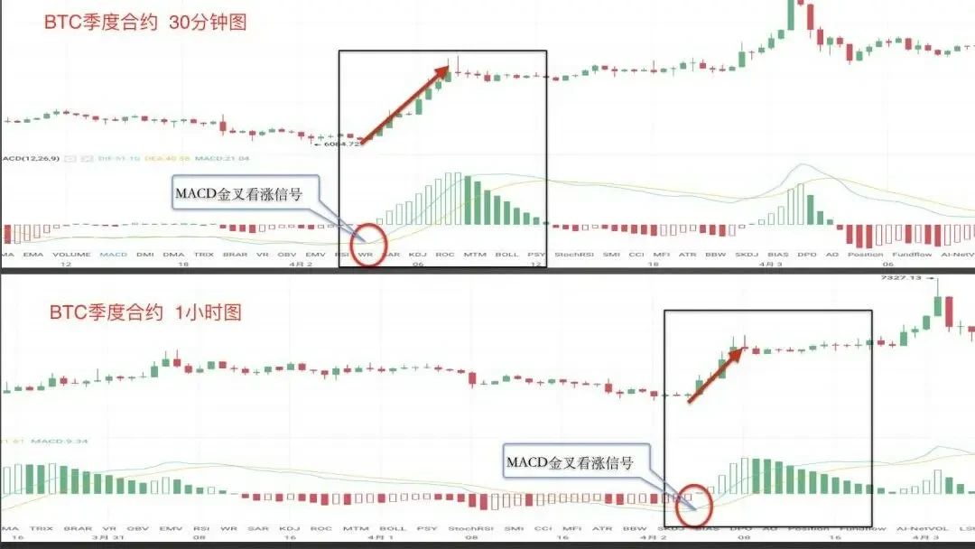 案例一为不同周期下MACD指标共振的实战应用,上方截图来自欧易 BTC季度合约30分钟图,下方截图来自欧易 BTC季度合约1小时图,黑线框区域分别为MACD在不同周期下相邻时间点共振情况,当不同周期内,MACD都形成金叉后,此为双重看涨信号,随后币价开始上涨。