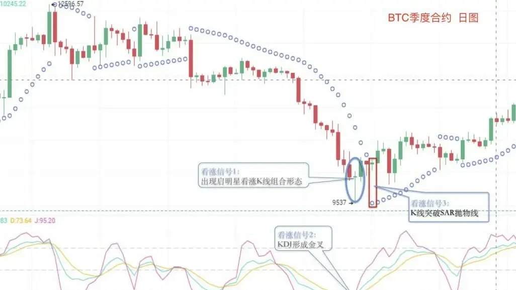 案例四为SAR、KDJ指标和启明星看涨K线组合的综合应用,截图来自欧易 BTC季度合约日线图,如图所示,当底部出现启明星看涨K线组合形态时,此为看涨信号1;同时KDJ指标形成向上金叉,出现看涨信号2;随后币价突破并站上SAR抛物线指标时,此为看涨信号3。