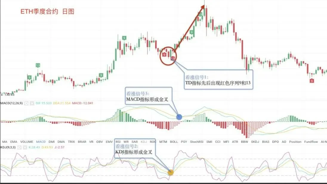 案例四为TD指标、MACD和KDJ指标的综合应用,截图来自欧易 ETH季度合约日线图,当TD指标先后出现红色序列9和13,此为看涨信号1;同时下方KDJ指标出现金叉,此为看涨信号2;接着MACD指标也出现了金叉,此为看涨信号3,随后币价开始了一波上涨。