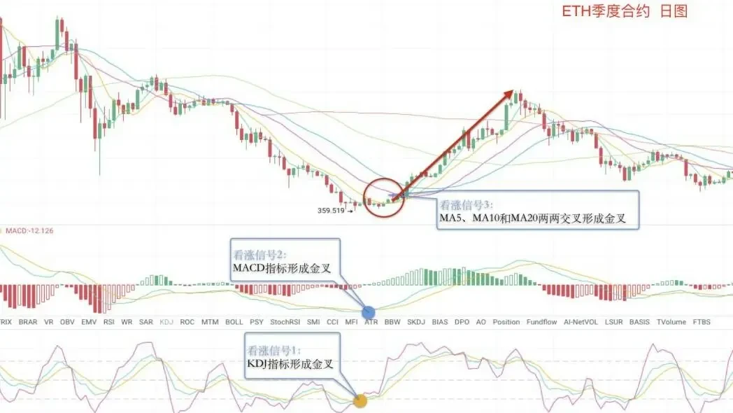 案例二为均线、MACD和KDJ指标的综合应用,截图来自欧易ETH季度合约日线图,如图所示,当下方KDJ指标形成金叉,此为看涨信号1;接着MACD指标也出现金叉,此为看涨信号2;随后MA5、MA10和MA20两两交叉形成金叉时,此为买入信号3,然后币价开始了一波上涨行情。