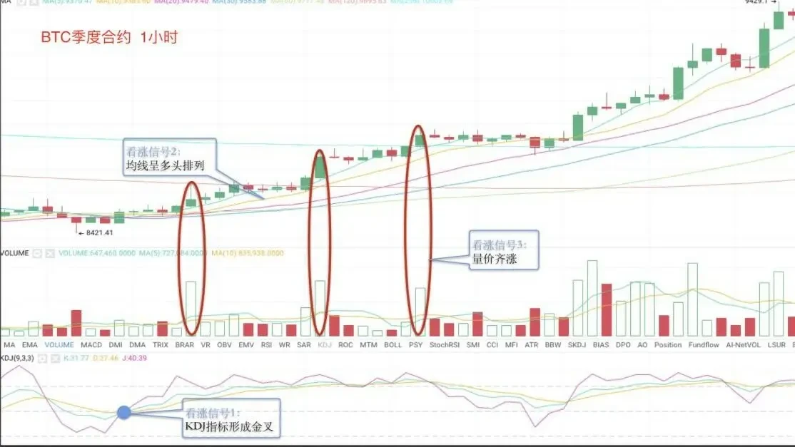 案例一为均线、成交量和KDJ指标的综合应用,截图来自欧易 BTC季度合约1小时图,当KDJ形成金叉时,出现看涨信号1;之后均线系统呈现向上的多头排列,币价沿均线上方运行,此为看涨信号2;随后成交量的每次放大为看涨信号3,带动币价进一步上涨。