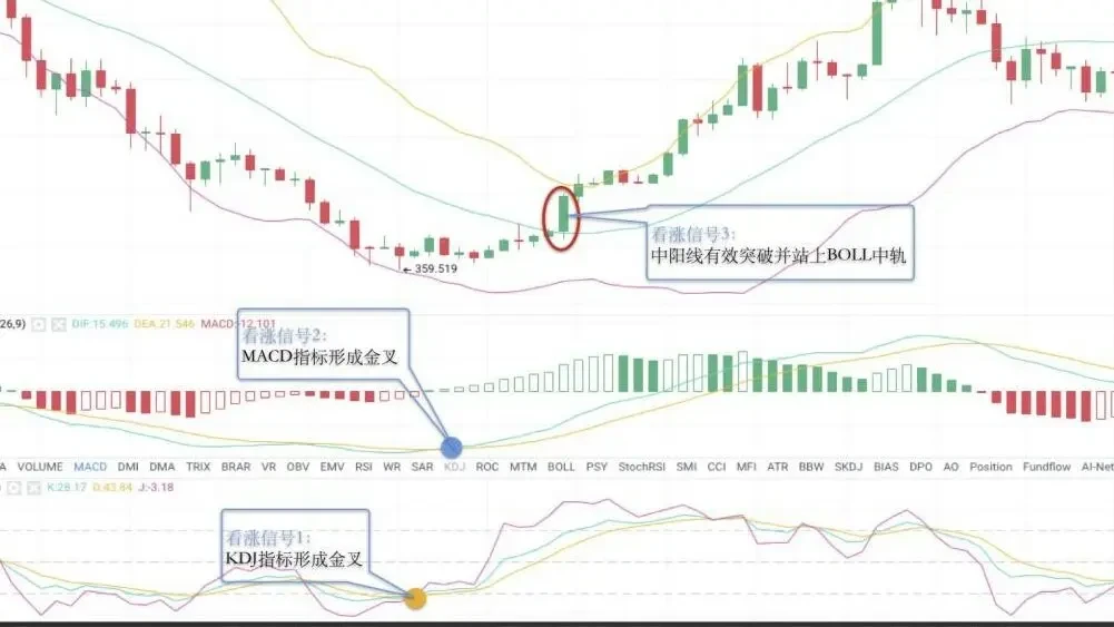 案例三为BOLL线、MACD和KDJ指标的综合应用,截图来自欧易 ETH季度合约日线图,当下方KDJ指标形成金叉,此为看涨信号1;接着MACD指标也出现金叉,此为看涨信号2;随后中阳线有效突破并站上BOLL中轨,此为看涨信号3。