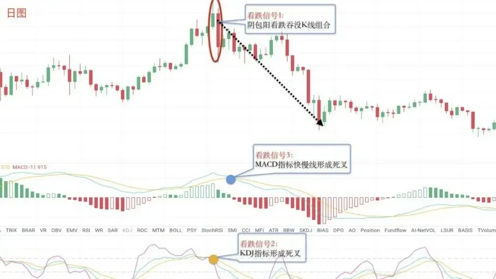 案例三为MACD、KDJ指标和看跌吞没K线组合的综合应用,截图来自欧易 ETH季度合约日线图,当高位出现阴包阳看跌吞没K线组合,此为看跌信号1;同时,KDJ指标形成死叉,此为看跌信号2;随后MACD指标快慢线也形成死叉,此为看跌信号3,之后币价开始下跌。