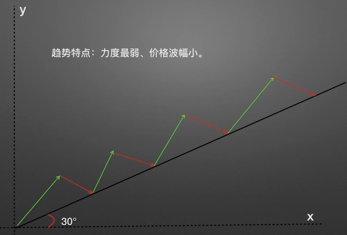 接下来是倾角为30度的上涨趋势线,相比于45度和65度上涨趋势线,30度趋势线上涨力度最弱,价格波幅较小。