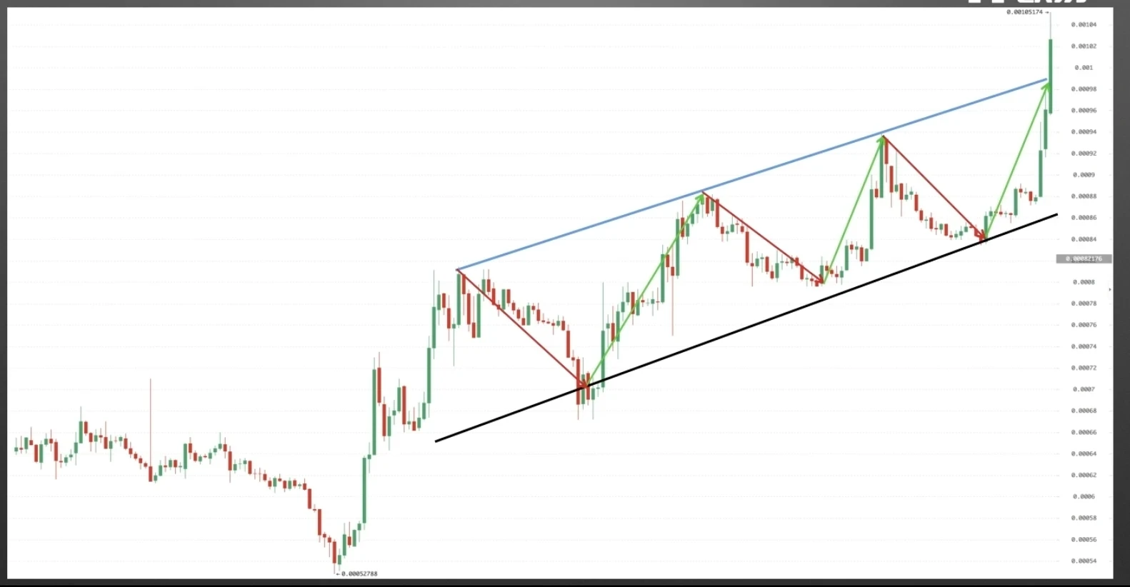 我们来看一个真实的案例。特别注意:当K线上穿趋势通道管道线时,预示着趋势的加速和增强;当K线下穿趋势通道线时,预示着趋势的减弱或反转。