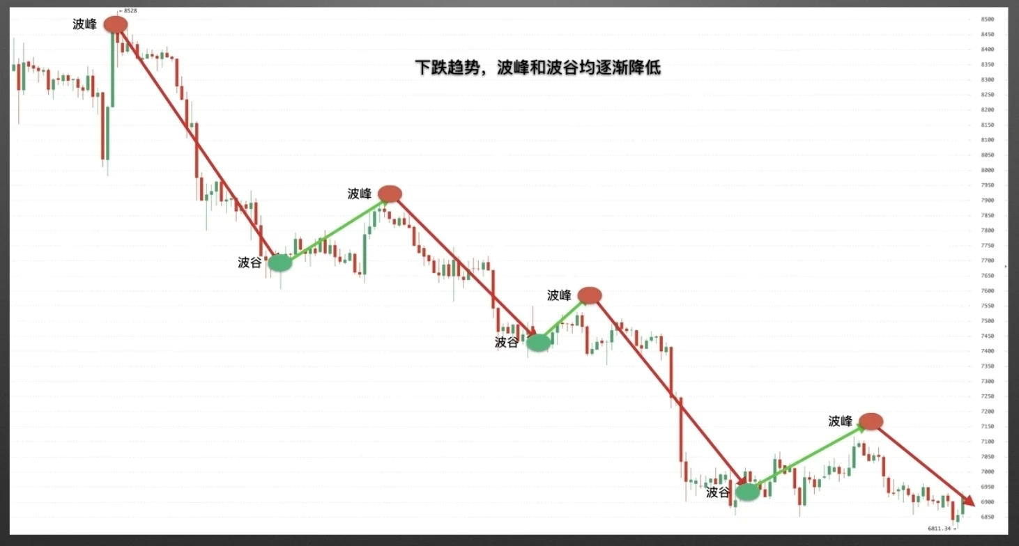 图为下跌趋势,正如我们所看到的,下跌趋势中,波峰和波谷均表现出逐渐降低的特点。
