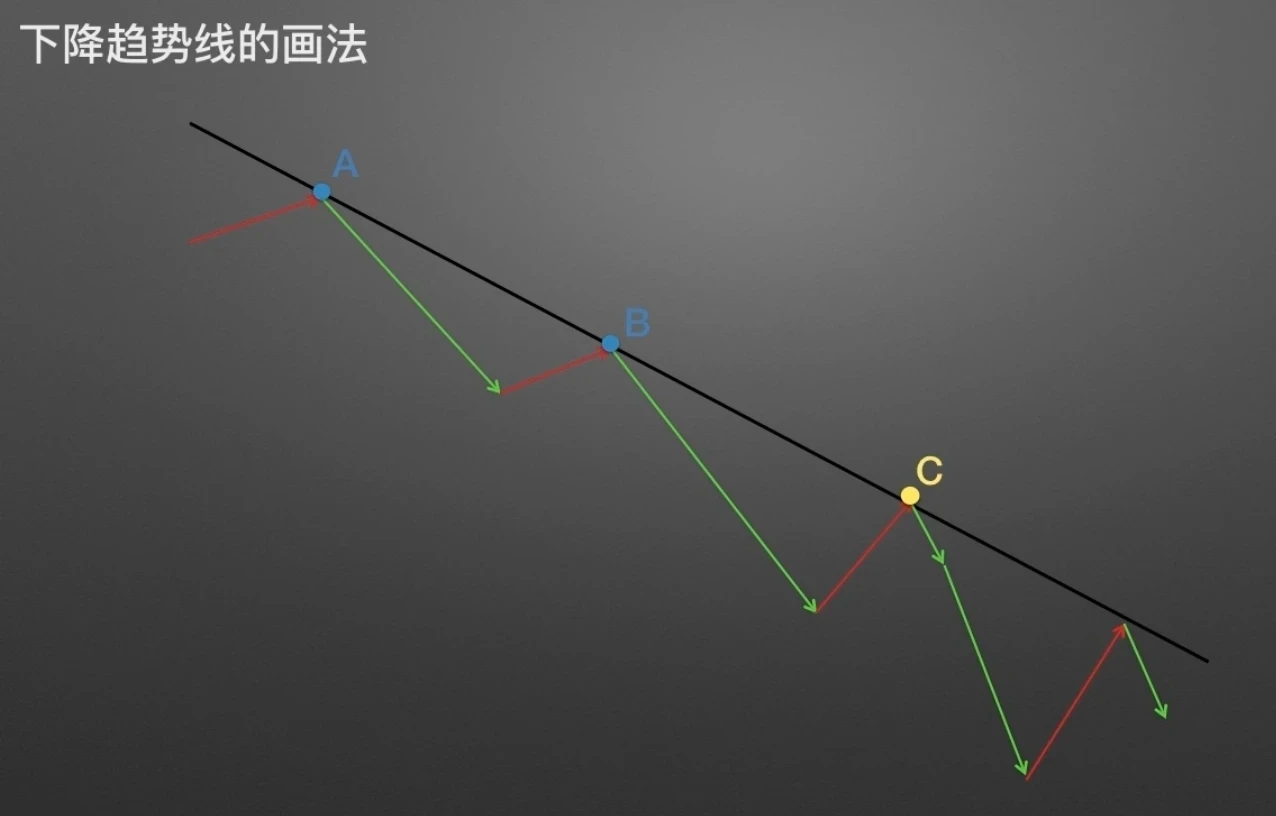 图为下降趋势线的画法,先找到A、B两个波峰,穿过两点确定一条直线,波峰C刚好落在直线上,确认该下降趋势线有效。趋势线主要是由投资者的心理作用形成压力、支撑效应,同样存在着“火鸡谬误”。第三个点确认趋势线成立以后,只是出现第四个、第五个点的可能性很大,并非一定会出现,而且趋势线的支撑或压力作用终究是会被打破的。